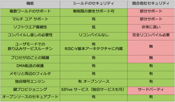下図に、SiFive社の発表資料から「シールド」「ワールドID」の競合他社との機能比較を示します。出展:SiFive社ウエブサイト、和訳:RISC-V協会