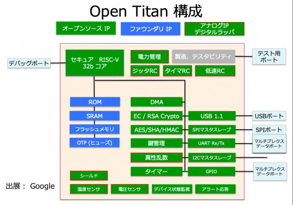 このプロジェクトは、データセンターとPixel Phoneで使用されている既知のルートオブトラストで起動を確認し、ファームウェアが改ざんされていないことを確認するGoogle独自のTitanチップにちなんで命名されました。 検証に使用される暗号要素は、Root of Trust(RoT)と呼ばれ、「Open Titan」プロジェクトの中心です。下図に「Open Titan」のブロック図を示します。出展:Google社発表、和訳:RISC-V協会