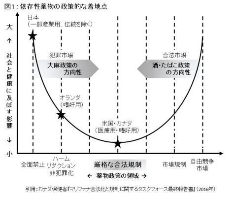 図1 依存性薬物の政策的な着地点 カナダの嗜好用大麻は厳格な合法規制であり、アルコールおよびタバコと比べて規制が厳しい。