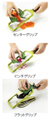「フラットグリップ」はナスやジャガイモのほか、「センターグリップ」「ピンチグリップ」でつかめなくなった野菜を上から押さえつつ最後までスライスすることができます。