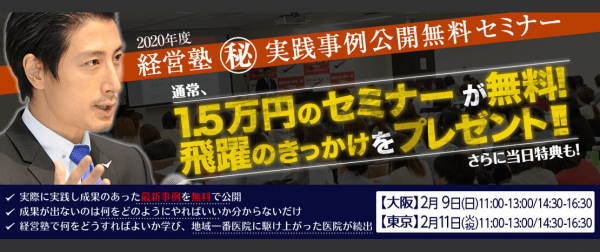 歯科医院専門のコンサルティング会社、経営戦略研究所株式会社(本社:神奈川県横浜市 代表取締役社長:岩渕龍正)は、2020年2月9日(日)に新大阪ブリックビル、11日(火・祝)にAP品川アネックスにて、「経営塾(秘)実践事例公開無料セミナー」を開催いたします。