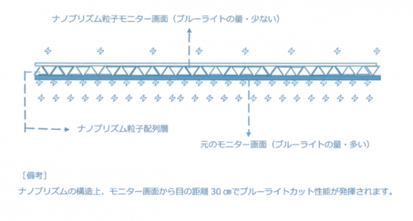 液晶画面に塗布すると、ナノプリズム粒子が整列した皮膜が形成され、ブルーライト特有のチラ付き(散乱)を画面上で吸収、チラつきを減少させることで目への負担を軽減します。(※ナノプリズムの構造上、モニター画面と目の距離が30cm以上でブルーライトカット性能が発揮されます)