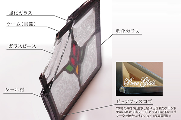 また、「本物のステンドグラスドア」は、安全面と耐久性も考慮し、ステンドグラスの両面を強化ガラスで挟んだ「三層構造」を取り入れています。以前は、採光のために単板ガラスのドアや、単層のステンドグラスをドアに取り付けられるご家庭も多くありましたものの、最近はドア開閉時の破損・安全面かから懸念される声を伺い、そのブレークスルーに採用したものです。「三層構造」は、破損の心配を大きく低減させたうえ、ステンドグラス自体の劣化を防ぎ、末永くお楽しみいただけるものです。ですので、通常のステンドグラスにはない保証もお付けしています(破損保証2年、結露保証1年)。更に、防音、断熱の効果にも優れています。