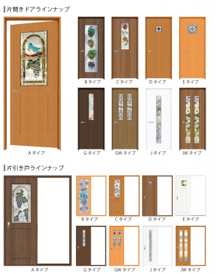 お求めは、カタログから、お好きなステンドグラスとドアを選んでいただき、あとは、ドア及び開口部の採寸をするだけ。親子ドアでも、引き戸でもオーダーで制作できます。ドア単体、枠付きのドアでも承れます。ドアの面材も規格7色の他、オプションで約50色をご用意しました。