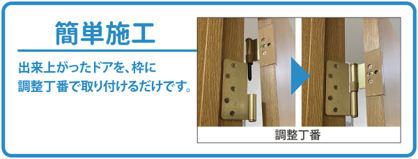 お届けしたドアは、大工さんで簡単にできます(ドア単体は旗丁番。枠付きドアの場合は調整丁番)。