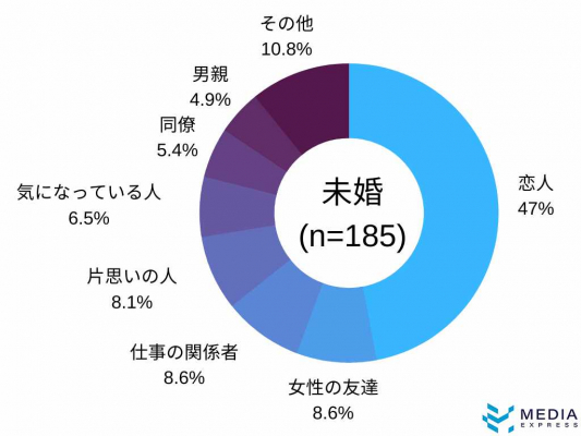 未婚者の場合は、「恋人」が1番ではありますが、続いて「女性の友達(友チョコ)」、「仕事の関係者」ほか、さまざまな方面へ、チョコレートを渡す予定があるという回答でした。