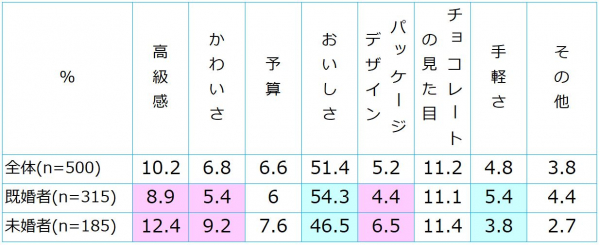 既婚者と未婚者それぞれが、メインの方へ贈るチョコレートには、何を1番優先する?