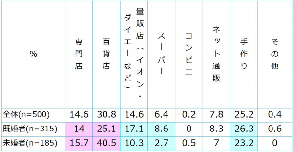既婚者の傾向としては、既製品を購入するのではなく、手作りのチョコレートを贈る、もしくは通常の買い物と一緒に購入できる「量販店」や「スーパー」を利用する傾向があり、未婚者は、チョコレートを購入することを目的に「百貨店」へ出向いているのではないかと予想されます。