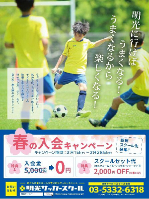 〜もっとうまくなりたいという気持ちに応えます〜 明光サッカースクール「春の入会キャンペーン2020」 【キャンペーン期間】2月1日(土)〜2月28日(金)