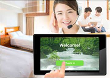 (写真左:タブレット端末を使った宿泊受付シーン 写真右:「あんしんステイIoT」の利用イメージ)