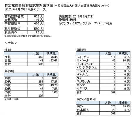 一般社団法人外国人介護職員支援センター(千葉県市川市、代表理事 井上文二)は、1月30日、外国人特定技能介護技能評価試験における受験者属性を、当センターが開催するオンライン試験対策講座の2019年9月27日講座開設日から2020年1月29日までのデータを分析し、ホームページ上で公表しました。