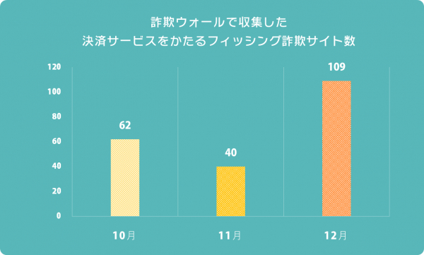 2019年12月度は決済サービス事業者をかたるフィッシング詐欺サイトが増加しました。詐欺ウォールで収集したクレジットカード会社やオンライン決済サービス会社をかたるフィッシング詐欺サイト数は、10月に62件だったものが、11月には40件まで減少し、12月は109件と前月の2.7倍まで増加しました。