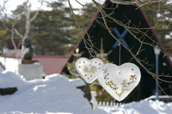 併せて、2月14日(金)のバレンタインデーのみ、通常は丸い輪の形をしている氷のリースを「ハート型氷のリース」に変えて、清泉寮周辺の木々に飾ります。スタッフの手作りで、氷の中に木の実や葉を入れて制作しています。一つずつデザインが異なりますので、記念撮影にも最適です。