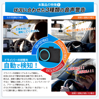 「わき見運転の場合」「居眠り運転の場合」「居眠り運転が続いた場合」ドライバーの状態を自動検知して、軽い音声注意、中程度の音声注意、強めの音声警告と3種類に使い分けて警告します。