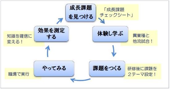 学びの効果を最大限に高めるために、以下のマネジメントサイクルを回しています。研修と現場を強制的につなげる事で、理論を現場で検証することができます。