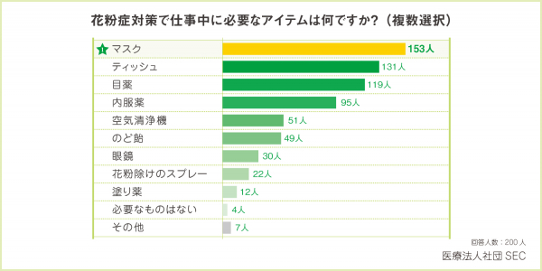 マスク:153人、ティッシュ:131人、目薬:119人、内服薬:95人、空気清浄機:51人、のど飴:49人、眼鏡:30人、花粉除けのスプレー:22人、塗り薬:12人、必要なものはない:4人、その他:7人