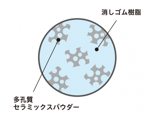 富士山消しゴムは、1989年に発売を開始したロングセラー消しゴム「エアイン」と同じ消しゴム樹脂を採用。多孔質セラミックスパウダーが無数のカドを生み出し、“いつもカドで消すような軽い消し心地”を実現しています。