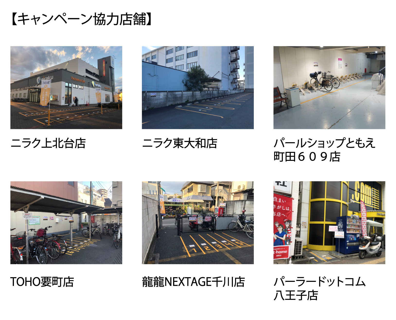 ニラク上北台店、ニラク東大和店、パールショップともえ町田609店、TOHO要町店、龍龍NEXTAGE千川店、パーラードットコム 八王子店