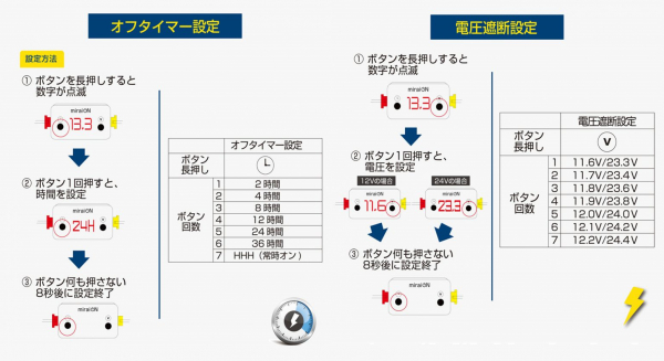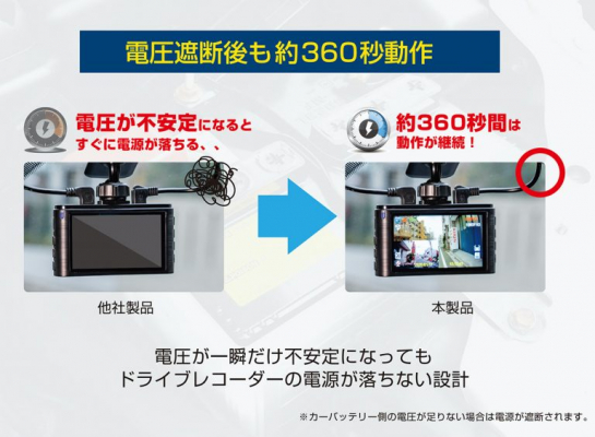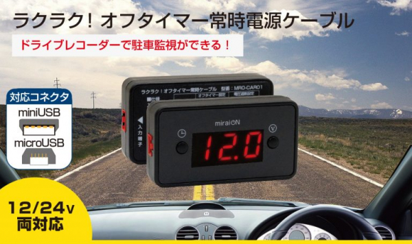 「ラクラク!オフタイマー常時電源ケーブル」は市販のドライブレコーダー(miniUSB又はmicroUSBコネクタ)に対応した常時電源ケーブルです。通電時間を選べるオフタイマー設定と電圧遮断設定の機能を搭載します。ディップスイッチ式よりも見やすいデジタル数字とボタンで簡単に設定できます。さらに新電圧遮断方式を採用し、電圧遮断後も約360秒動作してから通電終了となります。なお、360秒の間に設定した電圧値を上回れば通電継続となる設計のため、アイドリングストップ機能など一時的に電圧不安定な状態になってもドライブレコーダーの動作を終了しないまま続けて撮影できます。※すべてのドライブレコーダーでの動作を保証するものではございません。