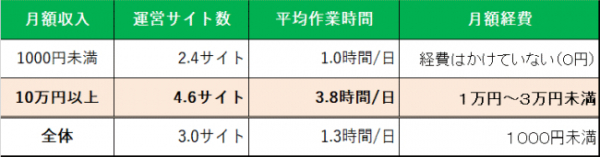 アフィリエイト市場調査2019の回答者を、月のアフィリエイト収入1,000円未満と10万円以上にグループ分けしてみた結果が下記テーブルです(※10万円以上のグループには月100万円以上のアフィリエイト収入がある個人・法人も含みます)。