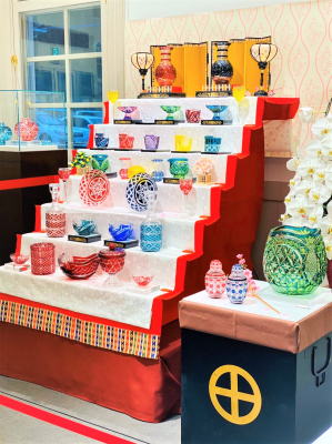 その磯工芸館では、この時期限定の薩摩切子をひなと見立てる『見立てひな段』を展示しております。今年で10回目を迎えたひな段は、島津薩摩切子復元35周年の今年を記念し「つなぐ」をテーマとしたラインナップを揃えました。