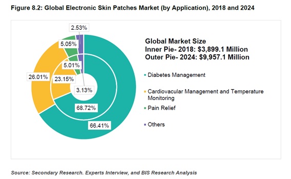 この図は世界の電子皮膚パッチ市場の応用別シェアを示しています。糖尿病管理は、2018年の時点で26億7930万米ドル、2024年には66億1270万米ドルに達すると予想されています。この間のCARGは16.55%となります。糖尿病の有病率の増加により、糖尿病管理は電子皮膚パッチ市場の2018年の収益に最も貢献しました。一方で、心血管管理、体温モニタリング向け市場は糖尿病管理を上回る17.39%のCAGRで拡大するとされています。これは、人々の間で健康とフィットネスに対する意識が高まっていることに起因しています。