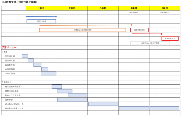 組合の会員のうち、特定技能介護士/介護職には完全無料にて在留中に介護福祉士国家試験合格を目指せる5か年教育支援プログラムが提供されます。また、就労先が組合の賛助会員の場合は、介護技能実習生、EPA介護福祉士候補者及び一般在留外国人介護職の人たちも同じプログラムを無料で利用できることに加えて、就労先賛助会員事業者には、外国人職員研修を行えるように同一プログラムのコンテンツ貸与もなされ、教育効果が高められる予定です。