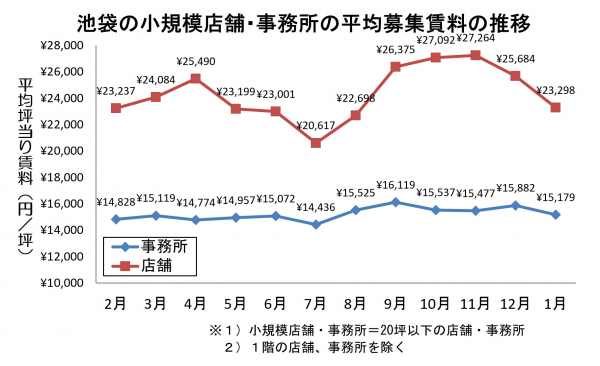 池袋の小規模事務所の1月度平均賃料が下降。小規模店舗も下降