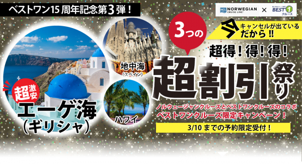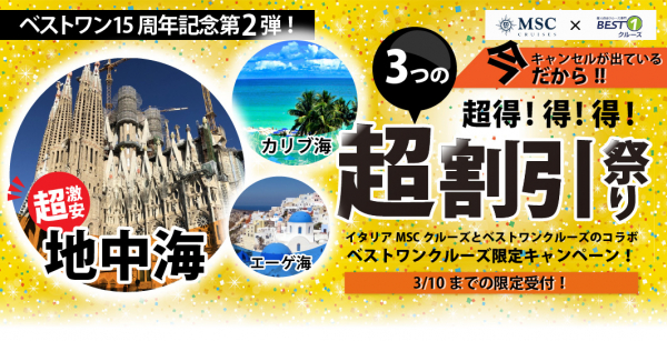 クルーズ予約サイト「ベストワンクルーズ」運営の株式会社ベストワンドットコム(本社:東京都新宿区、代表取締役:澤田秀太)は、迎春キャンペーンに引き続き、「今だからできる激安価格!15周年記念キャンペーン」第2弾、第3弾を2月27日より同時に開始いたしました。人気の海外発着クルーズ(地中海・エーゲ海)が格安でご予約いただけます。是非、この機会にご利用ください!