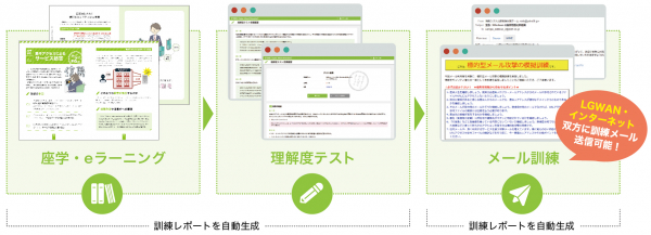 これまでのセキュリティ教育とメール訓練を両方実施できる基本機能はそのままに、総合行政ネットワークでの利用を想定し、LGWAN側と外部接続されたインターネット側のいずれへも訓練メールの配信が可能となります。情報セキュリティ教材は、サービス内に用意されたものから選択することも、自組織で用意したものを利用することも可能で、柔軟なセキュリティ教育を行うことが可能になります。訓練機能も教育機能も無料で毎月10名まで利用することができるため、小規模組織ではコストをかけずに情報セキュリティ教育・訓練を行うことができる点も特徴です。