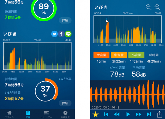 いびきを録音して聞くことも可能、録音せずに入力レベルだけで記録することも可能。録音されたデータは専用クラウドサーバに保管できるほか、Googleドライブに書き出すことも可能です(一部有料オプション)。