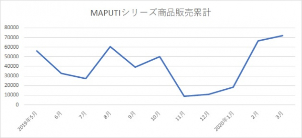もともと『MAPUTI』はボディケア商材という特性上、5月〜9月の注文が多く、冬場は1〜2万個の出荷に留まる傾向がありました。しかし2020年2月の注文数は昨年13,500個の約5倍にあたる66,300個を記録、3月に入っても受注は止まらず、異例の注文増が続いています。