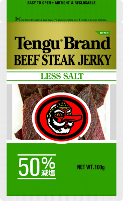 そのバリエーションに加わった最新の商品が、従来のイメージを一新した緑のパッケージで登場した『テング ビーフステーキジャーキー50%減塩』です。