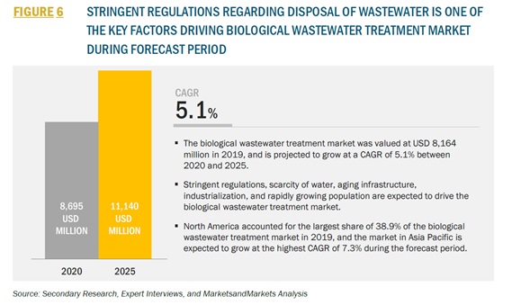 生物学的廃水処理市場は、2019年には81億6400万米ドルと評価され、2020年から2025年の間にCAGR 5.1%で成長すると予測されています。厳しい規制、水の不足、インフラの老朽化、工業化、急速に増加する人口が、生物学的廃水処理市場を牽引すると予想されます。
