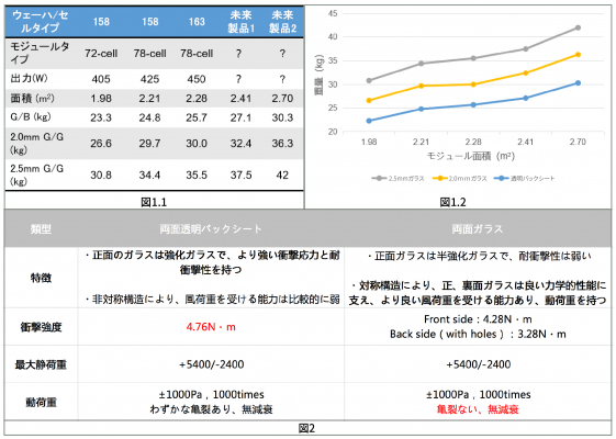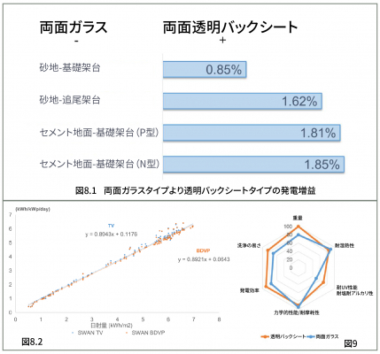 図9のように、両面ガラスタイプは耐湿熱性と機械的性質の面で優れるが、耐UV性能、耐塩耐アルカリ性 、重量、およびクリーン性の面で、透明バックシートタイプに及ばない、また発電効率の面でもやや弱いである。そのためには、透明バックシートタイプの各性能が優れている。