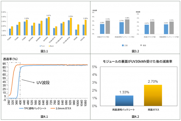 (3)屋外実測では,両面ガラスタイプのUV減衰は透明バックシートの倍に以上で、紫外線の強い地域では、両面透明バックシートタイプのリスクは低くなる。