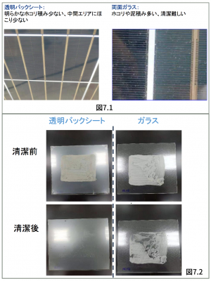透明バックシートタイプの表面は疎水性持ちのTedlarフィルムで、雨が降る時、ほこりがたまりやすい。両面ガラスタイプは親水性のため、洗浄しにくい。