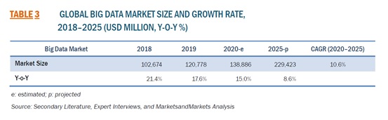 世界のビッグデータ市場規模は、2020年の1388億8600万米ドルから2025年までに2294億2300万米ドルに成長すると予測されており、予測期間中のCAGRは10.6%です。 テクノロジーコストの急落、オープンソースのビッグデータソフトウェアフレームワークの開発、ハイブリッドおよびマルチクラウド環境によるデータ接続、およびトップレベルの戦略へのデジタルトランスフォーメーションの組み込みが、ビッグデータ市場の成長を牽引しています。