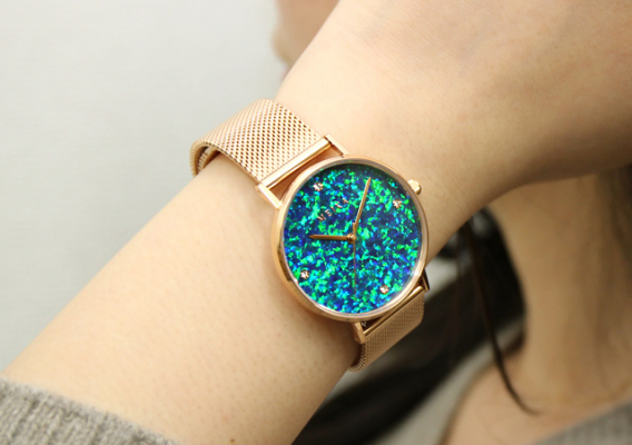 このあまりにも美しい京都オパールに魅了された開発者が、京都オパールをよりカジュアルに楽しめるように腕時計の文字盤に採用した製品を企画いたしました。
