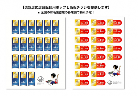販促ポップを楽器店に提供し、新入学シーズンに市場の活性化を促します。「エフェボー」では市場で流通するブランドのうち、550以上のブランドを登録しています。これらのブランドから派生する商品点数は膨大であり、特に自分に合う「サウンド・音」のエフェクターを選ぶのは大変な作業です。「エフェボーAWARD」は、