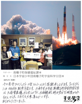 第1期サポーター募集では、19団体(個人を含む)のサポーター申込があり、南種子町の「日本宇宙少年団南種子町宇宙科学分団」や令和6年春に閉校となる「宇和島市立立間小学校」など20か所、計414台の天体望遠鏡贈呈が決まり、順次発送を開始している。