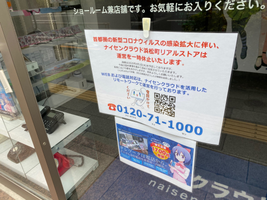ナイセンクラウド東京浜松町リアルストア(ショールーム)は実店舗であるため、運営を一時休止しております。