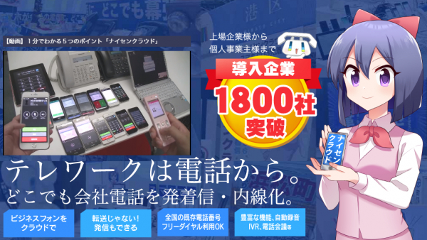 テレワークは電話から。お手持ちの電話番号をクラウド化してスマホで発着信・内線化。 最短2日導入、ナイセンクラウド初期費用無料キャンペーン延長(5月10日まで)