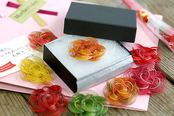 気持ちを届けるプレゼントに、母の日の特別なギフトラッピングもおつけしています。母の日の定番であるカーネーション(フェイクフラワー)を一輪、そしてご希望の方には手提げ袋やメッセージカードを。少し大きめの紙の手提げ袋となっていますので、他のプレゼントも一緒にしてお渡しいただけそうです。また繊細なブローチですので専用の小箱にお入れし、虎竹をあしらったオリジナルの包装紙でラッピングさせていただきます。
