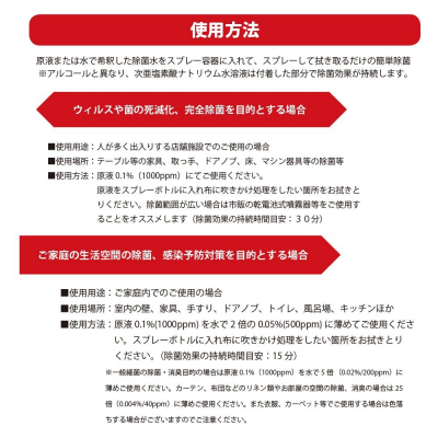 ○使用方法:原液(1000ppm)を水で2倍に薄め(500ppm)ご使用ください。