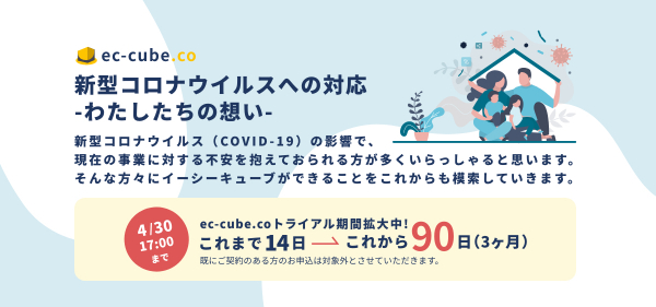 株式会社イーシーキューブ(本社:大阪府大阪市北区 代表取締役:岩田 進 以下、当社)は、新型コロナウィルスに対する支援策 第1弾として、EC-CUBEのクラウド版「ec-cube.co」の無料トライアル期間を2020年4月12日より14日から90日に延長し提供開始すること発表いたします。
