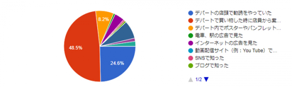 「デパートの店頭で勧誘をやっていた」「デパートで買い物した時に店員から案内された」を合わせると7割超