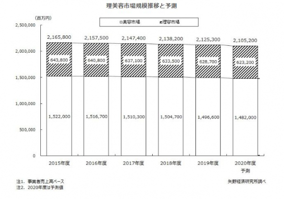 【矢野経済研究所プレスリリース】理美容市場に関する調査を実施(2020年)〜2019年度市場は前年度比99.4%の2兆1,253億円、店舗減少、来店客数や来店サイクルの低下などにより市場は微減傾向へ〜