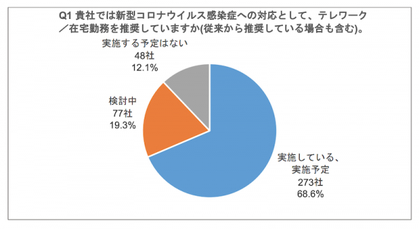 また、経団連の新型コロナ感染症拡大防止対策の実施状況に関する調査によると、(2020.2.28〜)約7割の企業がテレワークの導入をすでに行っています。