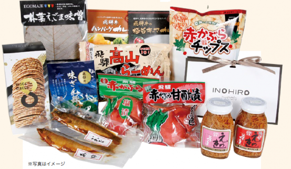 :ぼっか煮(いわな・あゆ各1),味ざん舞(90g),飛騨高山ラーメン(8食入り),赤かぶら青唐がらし漬,豆乳担々麺(2食入り),えのき茶漬け/同 唐辛子入り,ハンバーグカレー(1人前),朴葉味噌,